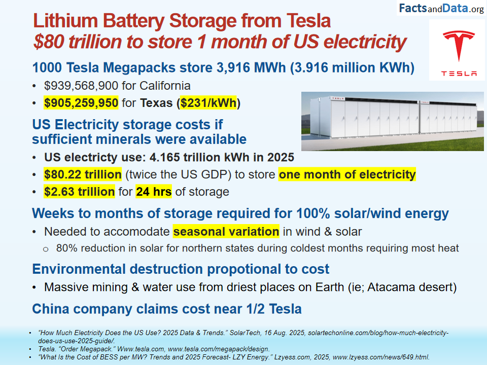 Elon Musk’s claims that the US can generate reliable power for the entire country using wind, solar, and battery storage (produced by his company) fall apart under the microscope of 3rd-grade arithmetic.